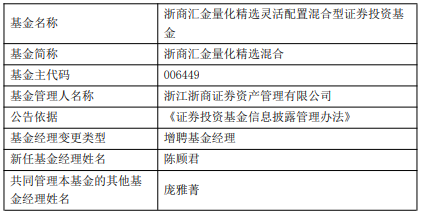 中国经济网北京130日讯 昨日,浙商证券资产管理有限公司公告,浙商汇金量化精选混合增聘陈顾君。