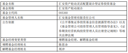 汇安资产轮动混合增聘陈思余 周冲离任