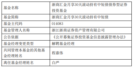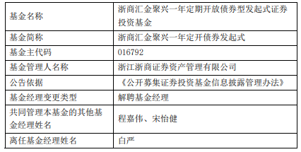 中国经济网北京2月2日讯 近日,浙商证券资产管理有限公司公告,白严离任浙商汇金月享30天滚动持有中短债、浙商汇金聚泓两年定开债、浙商汇金聚兴一年定开债券发起式、浙商汇金金算盘货币、浙商汇金聚盈中短债、浙商汇金中证同业存单AAA指数7天持有、浙商汇金聚利一年定期。