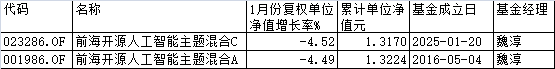 中国经济网北京2月3日讯 今年1月份,在A股强劲上涨的背景下,前海开源人工智能主题混合C、前海开源人工智能主题混合A却分别下跌4.52%和4.49%。