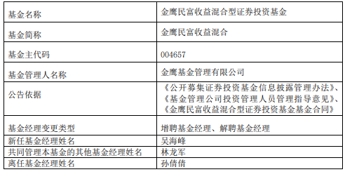 中国经济网北京2月4日讯 今日,金鹰基金公告,金鹰民富收益混合增聘吴海峰,孙倩倩离任。