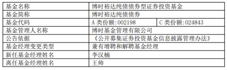 中国经济网北京2月4日讯 今日,博时基金公告,博时裕鹏纯债债券、博时裕达纯债债券增聘李汉楠,王帅离任。