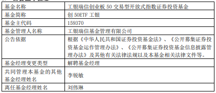 中国经济网北京2月9日讯 近日,工银瑞信基金公告,刘伟琳离任工银瑞信创业板50ETF。