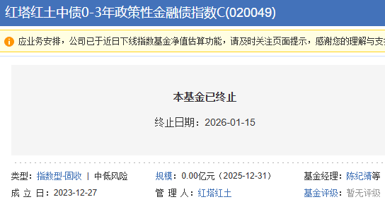 截至2026年1月14日,该基金已出现连续50个工作日基金资产净值低于5000万元的情形,该基金已触发《基金合同》中约定的基金终止条款。基金管理人已于2026年1月15日就该事项发布了《红塔红土基金管理有限公司关于红塔红土中债0-3年政策性金融债指数证券投资基金基金合同终止及基金财产清算的公告》,该基金最后运作日为2026年1月14日,自2026年1月15日起进入基金财产清算程序。