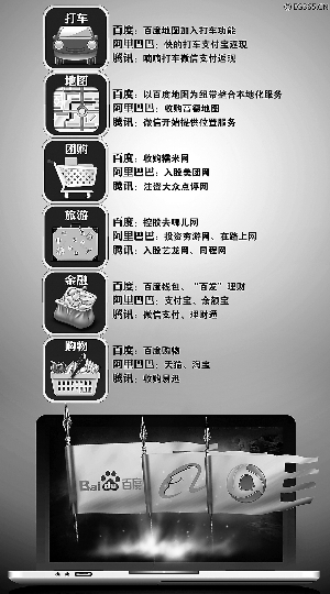 这就是近期席卷大街小巷的“手机打车热”。推动者无他,还是腾讯和阿里巴巴等互联网公司。将自己的支付宝、微信等拳头支付产品接入打车软件,用户在享受打车实惠的同时也在潜移默化中培养了移动支付习惯。而看似“BAT”(百度、阿里、腾讯)俱乐部“三缺一”的打车格局中,无论是嘀嘀或是快的,使用的也都是百度提供的LBS地理位置服务。