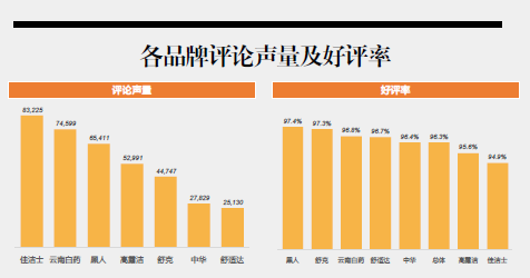 在监测的所有品牌中,佳洁士评论声量最高,其次是云南白药,然后是黑人,中华和舒适达评论声量相对较低;从好评率来看,黑人好评率最高,其次是舒克,然后是云南白药,除了这三个品牌外,舒适达和中华的好评率也高于行业总体好评率,高露洁和佳洁士的好评率低于行业总体,其中评论量最高的佳洁士好评率最低。