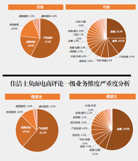 具体到品牌而言,排在评论声量第一的佳洁士出现排名倒挂,好评率排名最低。佳洁士产品品质严重度高于行业产品品质严重度,在产品品质方面,“容量”的严重度也远远高于行业的严重度,几乎是后者的两倍。不过,在正面电商评论一级业务维度中,佳洁士在“促销活动”方面的占比最高,略高于行业水平。