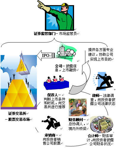 (3)对公司上市和交易相关的专业顾问进行监管,例如参与上市过程的保荐人、承销商、会计师、律师、证券经纪商(如证券公司)。