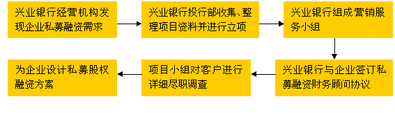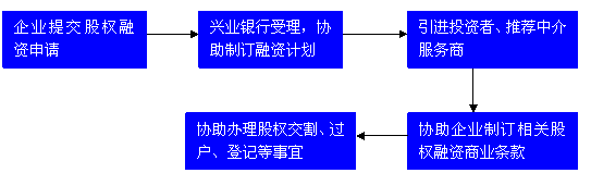 私募股权融资金融服务专案是指兴业银行为非上市公司股权融资或上市公司非公开交易股权提供的服务,即利用银行的客户资源和信息,以及与实力强大、资信优质的私募股权投资企业的业务合作关系,牵线搭桥,帮助企业引进战略投资者或财务投资者进行直接股权投资,也为企业股东投资退出(转让)提供服务。