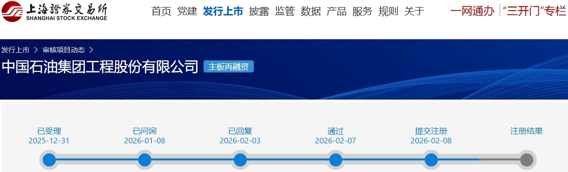 中国经济网北京2月9日讯 上交所网站披露的项目审核动态显示,中油工程(600339.SH)非公开发行股票于2026年2月7日获通过。
