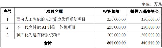 本次向不特定对象发行可转债拟募集资金总额不超过人民币800,000.00万元(含本数),募集资金总额扣除发行费用后用于面向人工智能的先进算力集群系统项目、下一代高性能AI训推一体机项目、国产化先进存储系统项目。