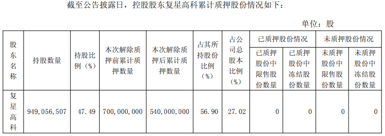 海南矿业2026年1月28日披露的关于控股股东部分股份解除质押的公告显示,截至公告披露日,公司控股股东复星高科持股数量为949,056,507股,持股比例为47.49%,本次解除质押后累计质押数量为540,000,000股,占其所持股份比例的56.90%,占公司总股本比例的27.02%。