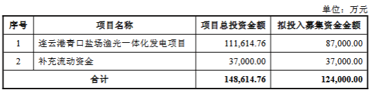 根据相关法律法规及规范性文件的要求并结合公司财务状况和投资计划,本次拟发行可转换公司债券的募集资金总额不超过人民币124,000.00万元(含124,000.00万元),发行数量不超过1,240.00万张(含1,240.00万张)。具体发行规模由公司股东会授权董事会在上述额度范围内确定。扣除发行费用后的募集资金净额将用于投入以下项目:连云港青口盐场渔光一体化发电项目、补充流动资金。
