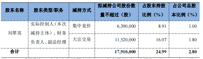 持有公司股份71,677,283股(占公司总股本639,788,841股的比例为11.2033%,总股本以剔除回购专用账户股份后的股份数量为计算依据,下同)的实际控制人之一刘翠英计划自公告披露之日起15个交易日后的3个月内(即2026年3月13日至2026年6月12日)通过深圳证券交易所集中竞价和大宗交易方式减持公司股份合计不超过17,910,000股(占公司总股本的比例不超过2.80%)。其中,通过集中竞价方式减持不超过6,390,000股(即连续90个自然日内减持股份的总数不超过公司总股本的比例不超过1.00%),通过大宗交易方式减持不超过11,520,000股(即连续90个自然日内减持股份的总数不超过公司总股本的比例不超过2.00%)。