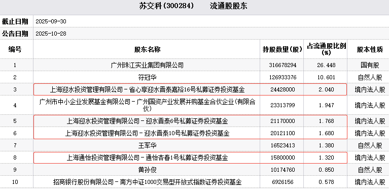 截止2025年9月30日,上海迎水投资管理有限公司-省心享迎水晋泰嘉裕16号私募证券投资基金持股数量24428000股,占流通股比例2.04%;上海迎水投资管理有限公司-迎水晋泰6号私募证券投资基金持股数量21170000股,占流通股比例1.768%;上海迎水投资管理有限公司-迎水晋泰10号私募证券投资基金持股数量20121100股,占流通股比例1.68%;上海通怡投资管理有限公司-通怡杏春1号私募证券投资基金持股数量15800000股,占流通股比例1.32%。