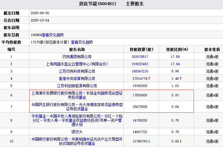 2025年三季度末,上海浦东发展银行股份有限公司-长信金利趋势混合型证券投资基金、中国民生银行股份有限公司-光大保德信信用添益债券型证券投资基金均持有双良节能股份,持股数量分别为17500000股和15672500股。
