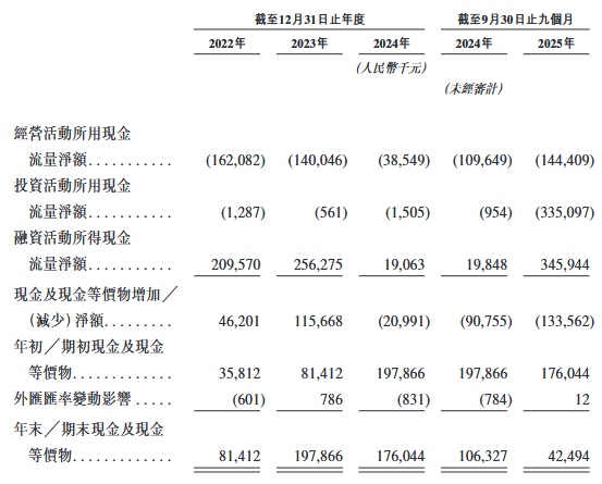 截至2022年、2023年、2024年12月31日止年度以及截至2024年及2025年9月30日止九个月,公司经营活动所用现金净额分别为人民币162.1百万元、人民币140.0百万元、人民币38.5百万元、人民币109.6百万元及人民币144.4百万元。