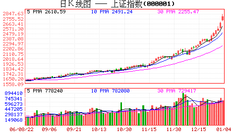 看盘:上午两市大盘跳空高开,单边震荡扬升至历史新高2847.61点和6730.12点,后在中行、马钢等权重指标股相继打开涨停板的施压下,股指回落,午后开盘一波急速杀跌,更显示出场内成交放量过快高位获利回吐风险渐增。   个股依然是涨多跌少。盘面有近20只个股涨停,涉及航空、钢铁、石化、汽车、地产等板块,100家以上个股涨幅超过5%,板块相对集中,个股行情百花齐放依然活力充沛,唯有色金属板块领跌。大盘K线7连阳,股指大幅扬升500余点的逼空走势,说明当前市场中确实存在着中国证券史上前所未有的机遇与挑战,成也萧何,败也萧何,国企大盘股是本轮行情的舵手。这一点毋庸置疑,也就是说想要与股指同步则必需与指标股一起沉浮。   看点:中海发展(10.53,0.18,1.74%)(600026),属物流运输板块,大盘股。公司拟发行20亿可转换公司债券,收购中海集团下属公司所有的四十二艘干散货运输船舶,加速扩张谋求大发展。二级市场走势稳健,突破在即,蓄势之后有望步入主升阶段。   后市:百点扬升的节奏感越来越强,政策面不变,则沪指突破3000点可期,站的高应看的远,短线震荡不阻大势扬升。