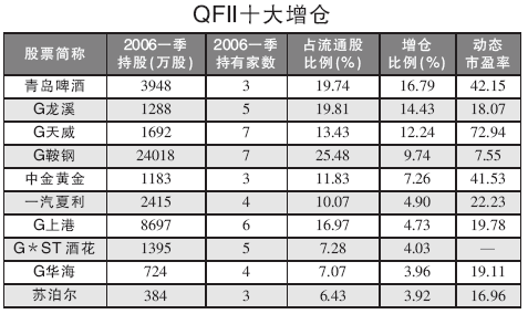 当季QFII增持幅度最大的股票则体现了QFII未来的选择。青岛啤酒、G龙溪、G天威、G鞍钢、中金黄金5只股票成为QFII一季度内增持比例最高的股票。显然,啤酒、汽配、新能源、钢铁、有色等契合全球市场热点和依托庞大中国市场的股票成为QFII的新宠。