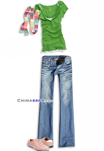 绿色大开领套头衫与仔裤搭配是活泼女孩的专属,彩条装饰带更添活跃